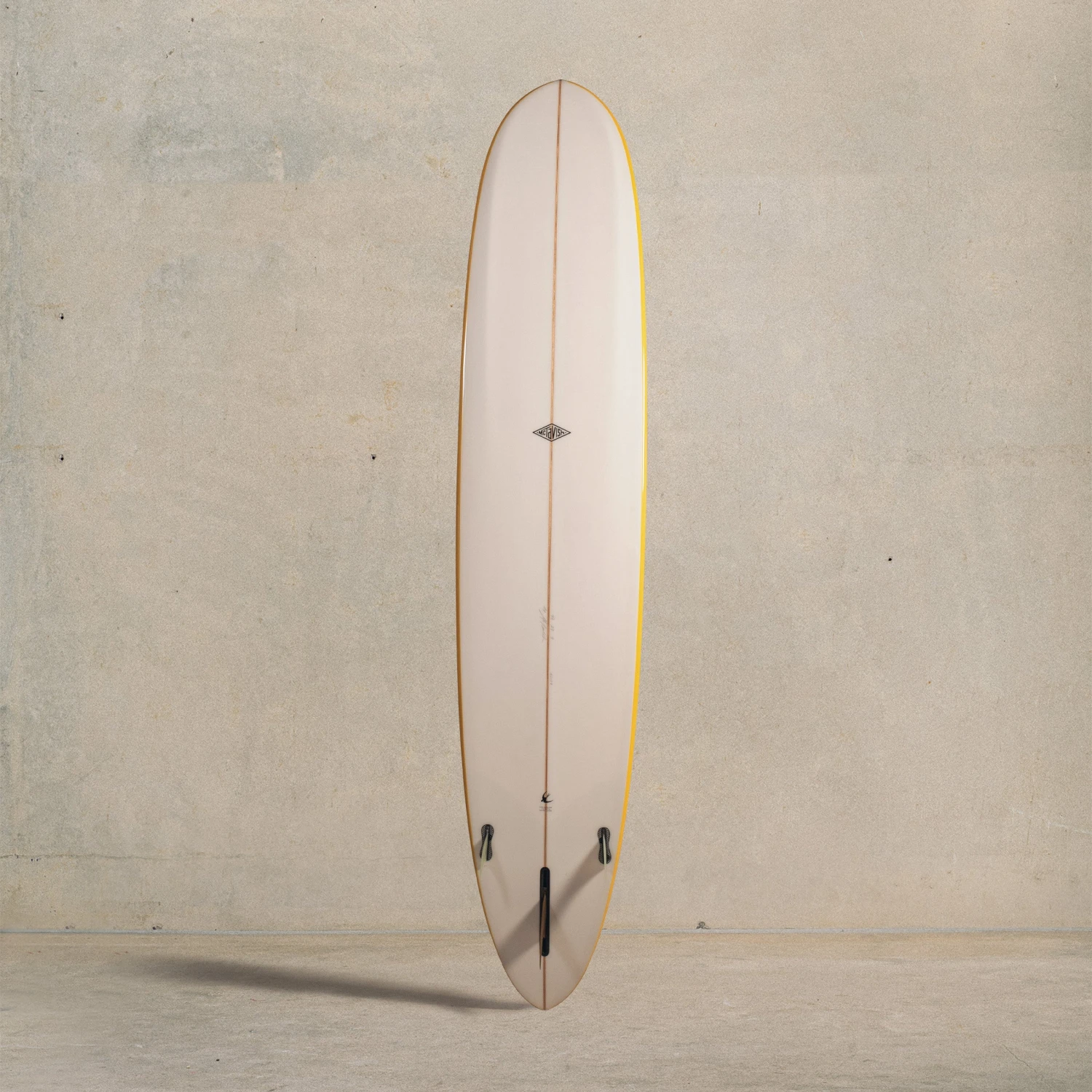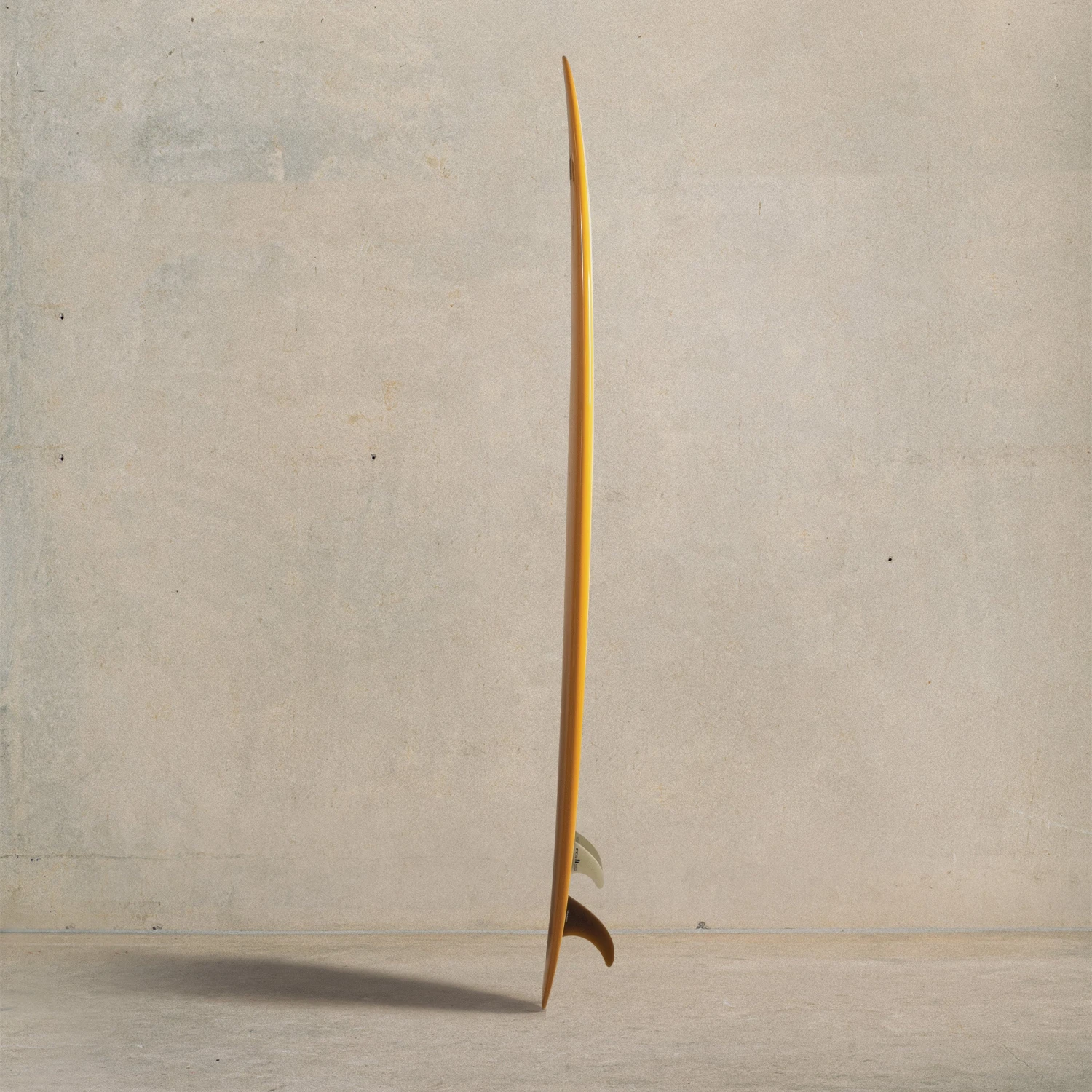 This 9’6″ x 23″ x 3″ Fireball features a Mango yellow deck and rail spray with signature racing stripe down the centre, volan fin patch and a polish finish. Fins sold seperately. We recommend the FCS II Quad Rear with the FCS 7″ Single Fin – both available at checkout.