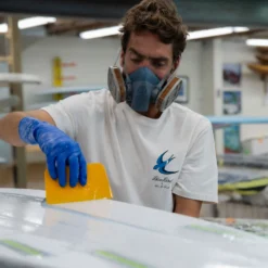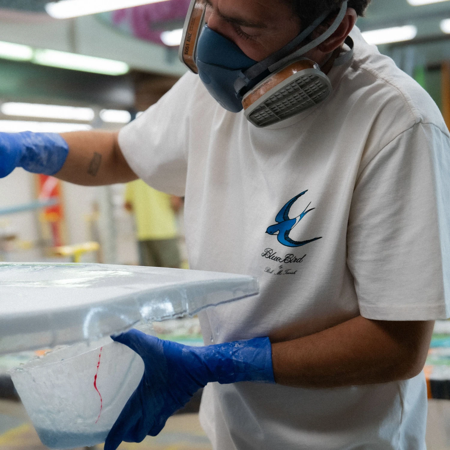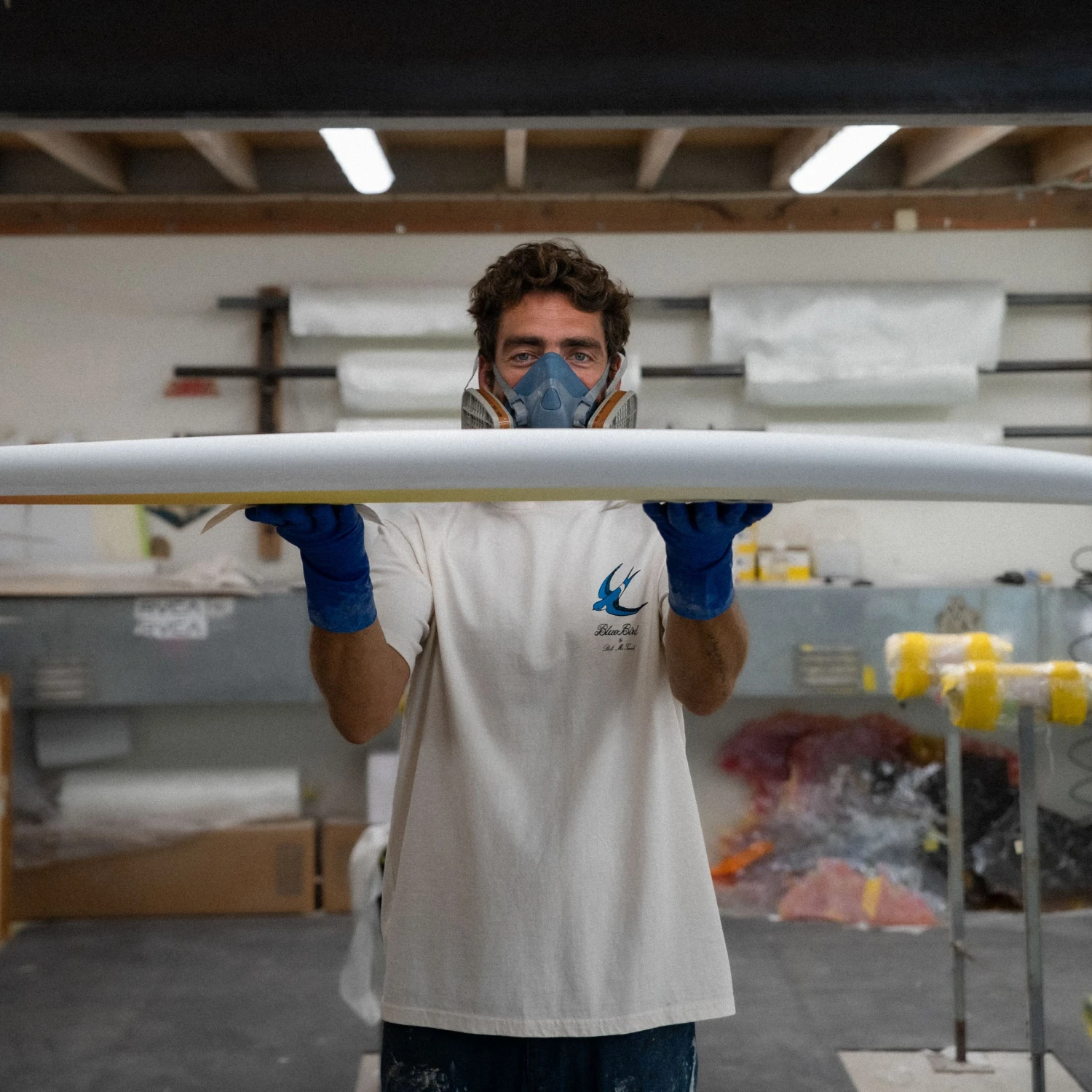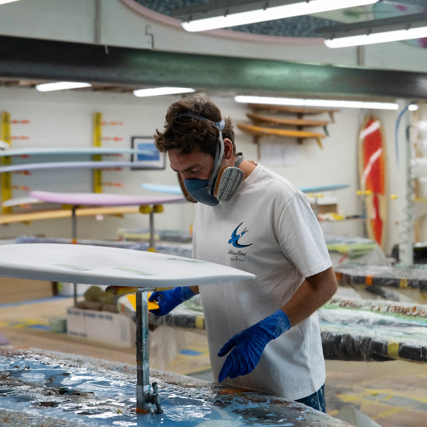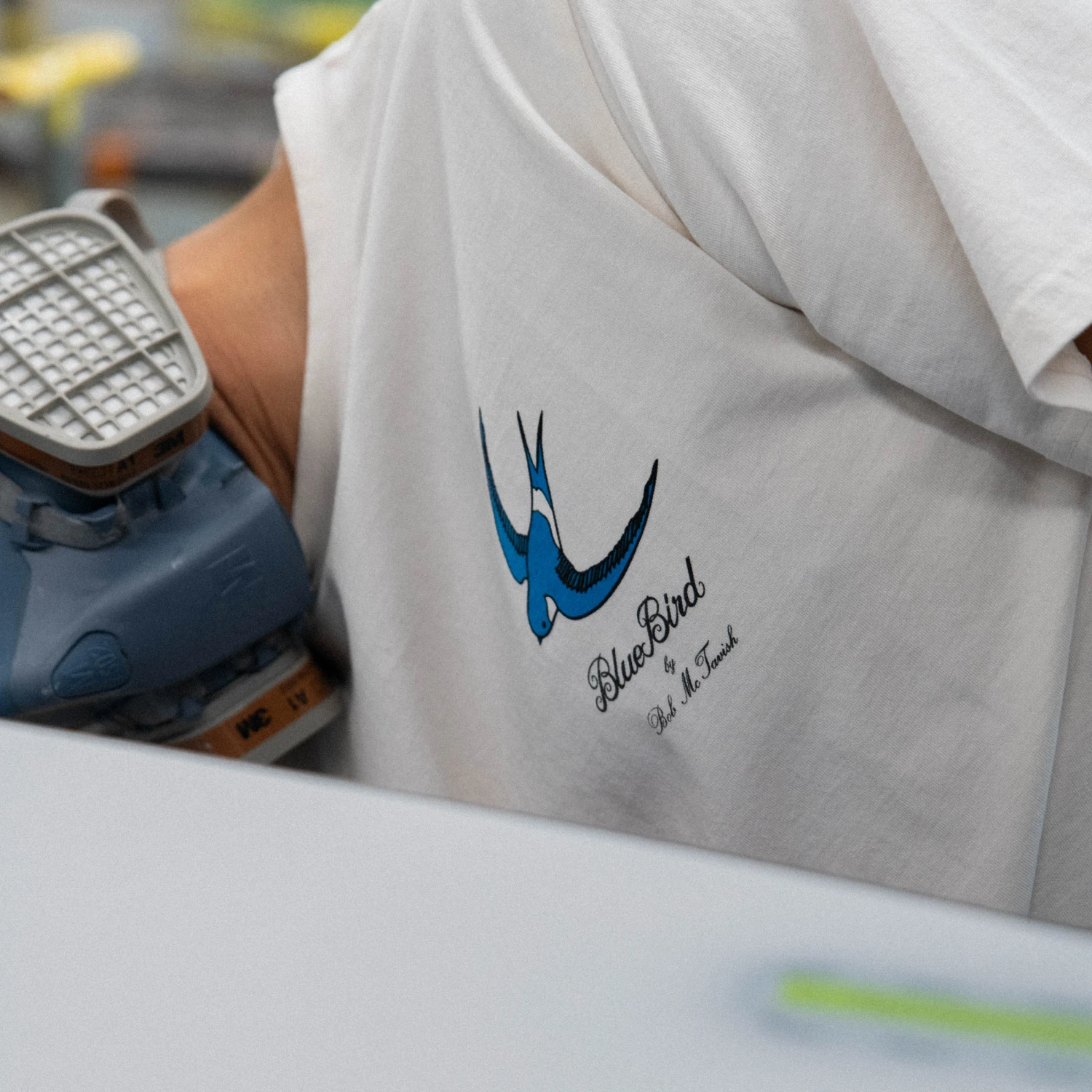One afternoon in 1973, Bob was taking in the sunset at the top of Lennox Point while watching swallows ducking, carving and picking insects out of the air. At the time, he was shaping some of the first swallow tails in Australia, along with beautiful pintails for Lennox waves, and this got him thinking about a logo. Inspired by the grace and manoeuvrability he saw that afternoon, Bob went to the library in Lismore, found a photograph of the Bluebird, got a photocopy, and took it to Northern Start Printer where he printed up the first round of Bluebird Logos. The bird appeared on most of Bob?s boards through the 70?s and is now used exclusively for the beautiful Bluebirds we still make today. Now available in a classic white tee made of a heavyweight 225g Organic Cotton.
