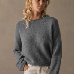 This relaxed knit has been spun from one of our favourite yarn blends yet, a cosy combination of Merino Wool, Hemp and Alpaca – for all the fuzzy warmth you could ask for. Slightly over- sized and cropped, it pairs perfectly with your favourite high-waist pants or thrown over your go-to shorts, apres surf. Available in Maple.