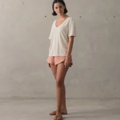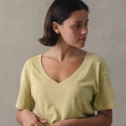 Cut from our favourite blend of hemp & cotton, this soft and drapey tee sits nicely with a deep plunging V and slightly dropped shoulder for optimum relaxation. Choose from vintage white Coconut and dusky yellow Sunshine.