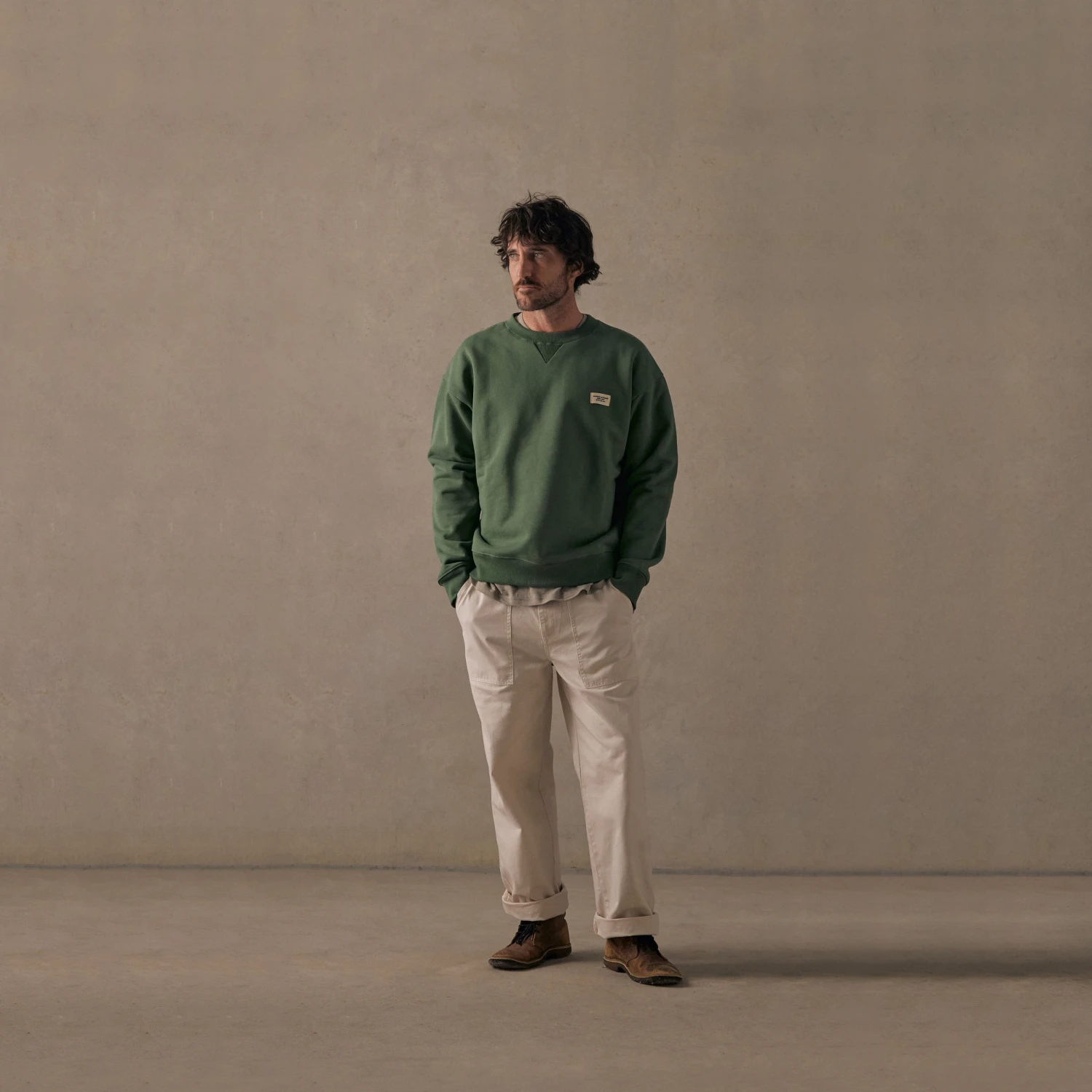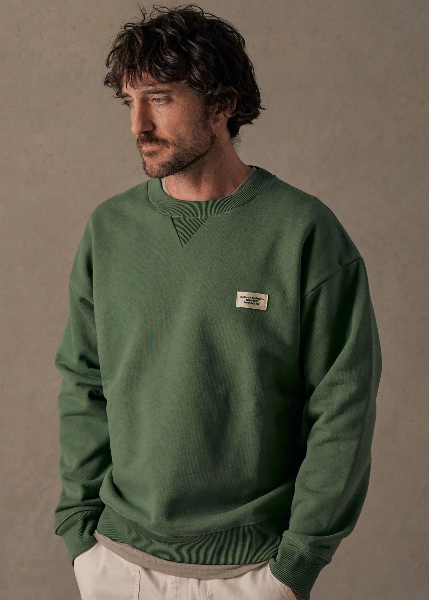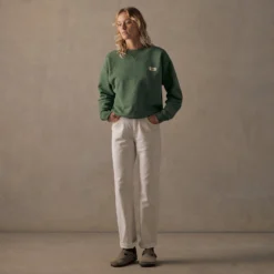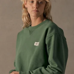 This boxy-style fleece crew is a hardwearing and warm staple made to be worn by everyone. Made of 100% organic cotton with a lightly brushed back French Terry that is washed for extra softness and a worn-in look and feel. This crew will keep you cozy with a soft, fuzzy interior and tough exterior. Available in sea green Moss.