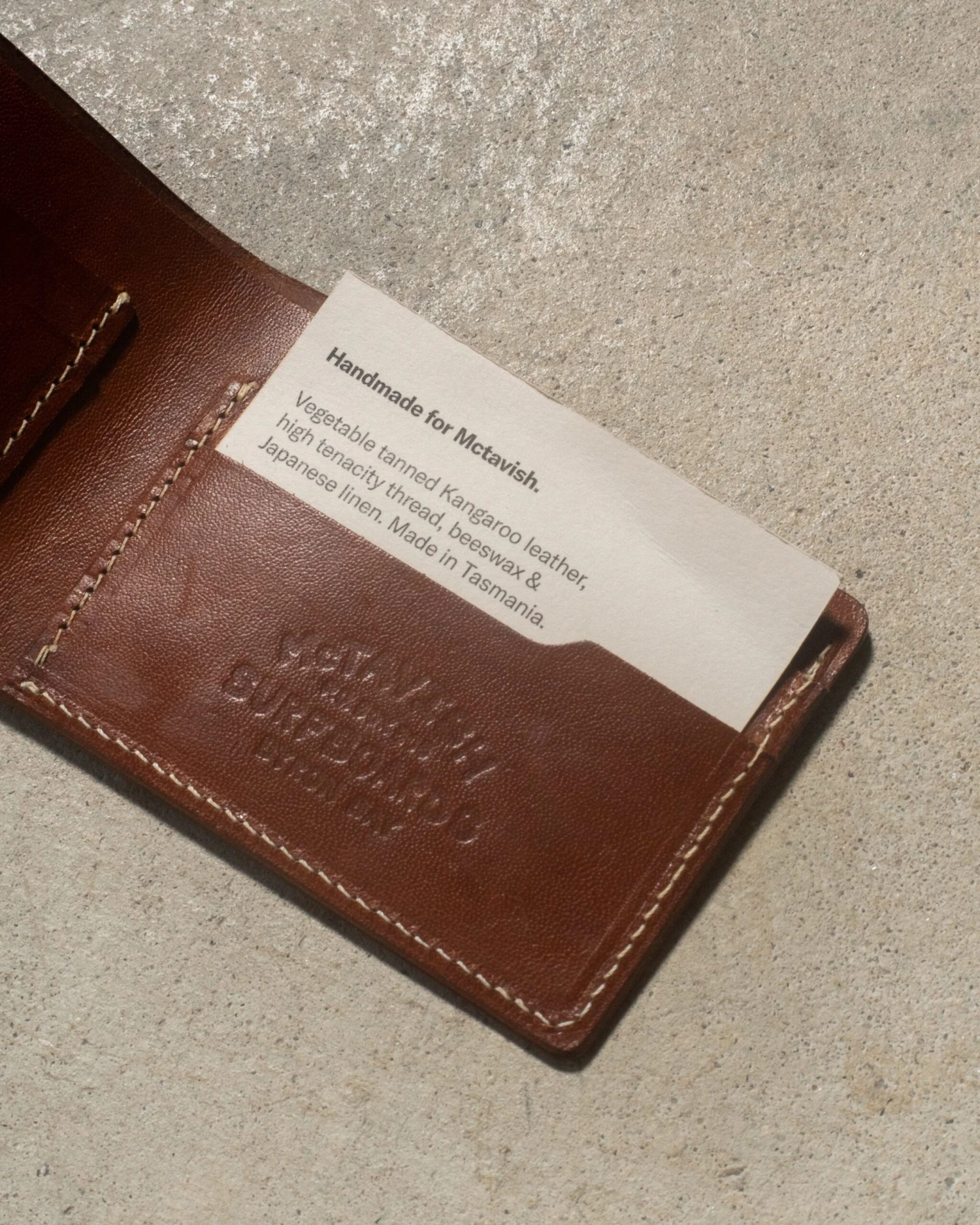 Handmade for Mctavish from vegetable tanned Kangaroo leather, high tenacity thread, beeswax and delivered in a Japanese linen bag. Made in Tasmania.