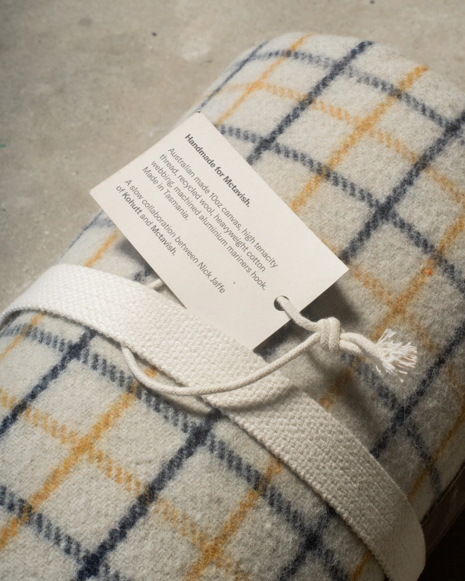 Handmade for Mctavish from Australian made 10oz canvas, high tenacity thread, recycled wool, heavyweight cotton webbing, machined aluminium mariners hook. Made in Tasmania. 140cm by 180cm.