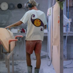 The iconic ?Plastic Machine? logo donned by the first vee-bottom shortboard to go vertical way back in 1967! Hand drawn by Bob amid the hippie, flower power, and psychedelic movement of the late 60s, Bob was inspired by the red centre circle and font from a Donovan album. Bob shared the drawing with his printer in Brookvale, Jim, who added the paisley wings. It was one of the first psychedelic logos on a surfboard and is now available on our limited-run heavyweight 225g Organic Cotton tee.