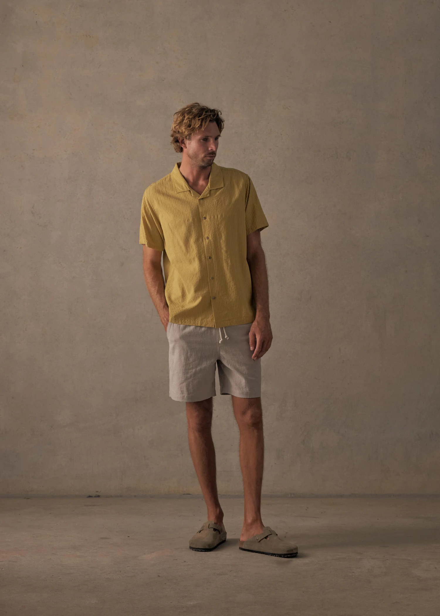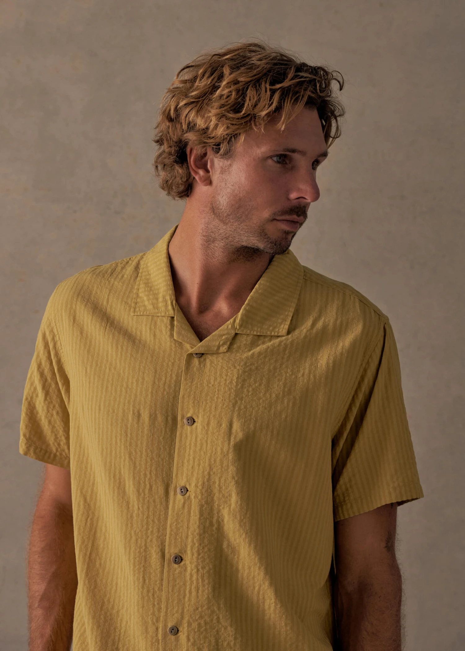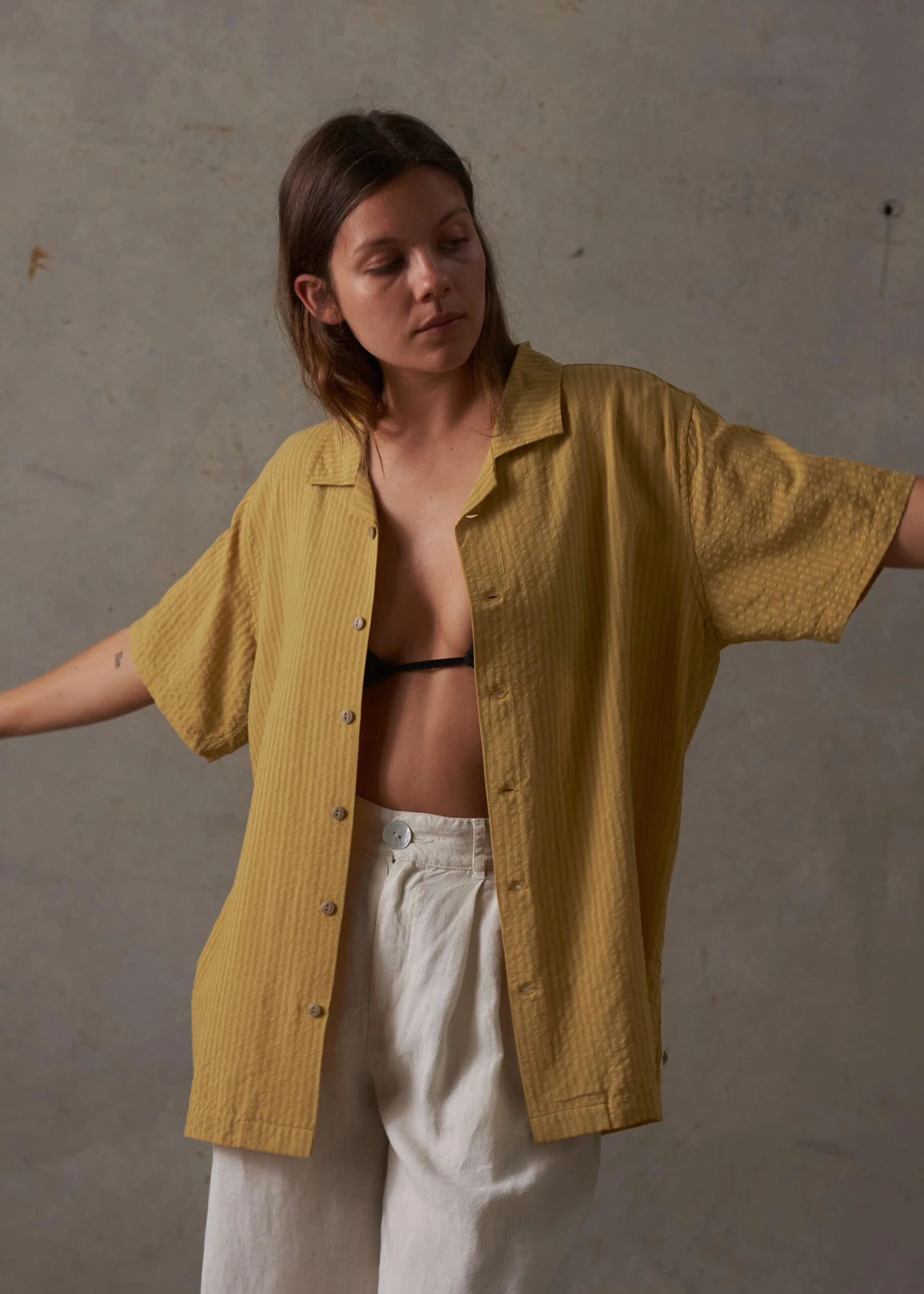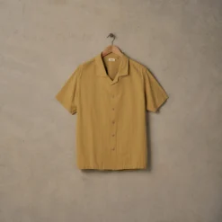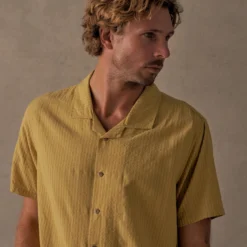 Equal parts nostalgia and elevated relaxation, this softly seersucker-esque textured shirt is silky smooth against your skin – but won’t have you sweating up underneath. It features corozo summarys, relaxed camp collar styling and it’s available in three unique colours; sage, saffron, and north sea.