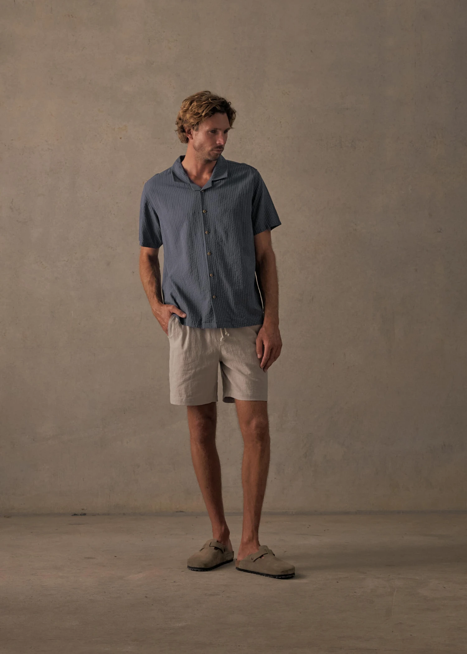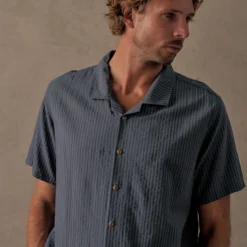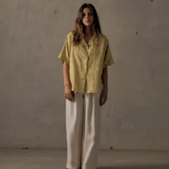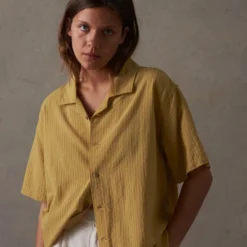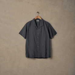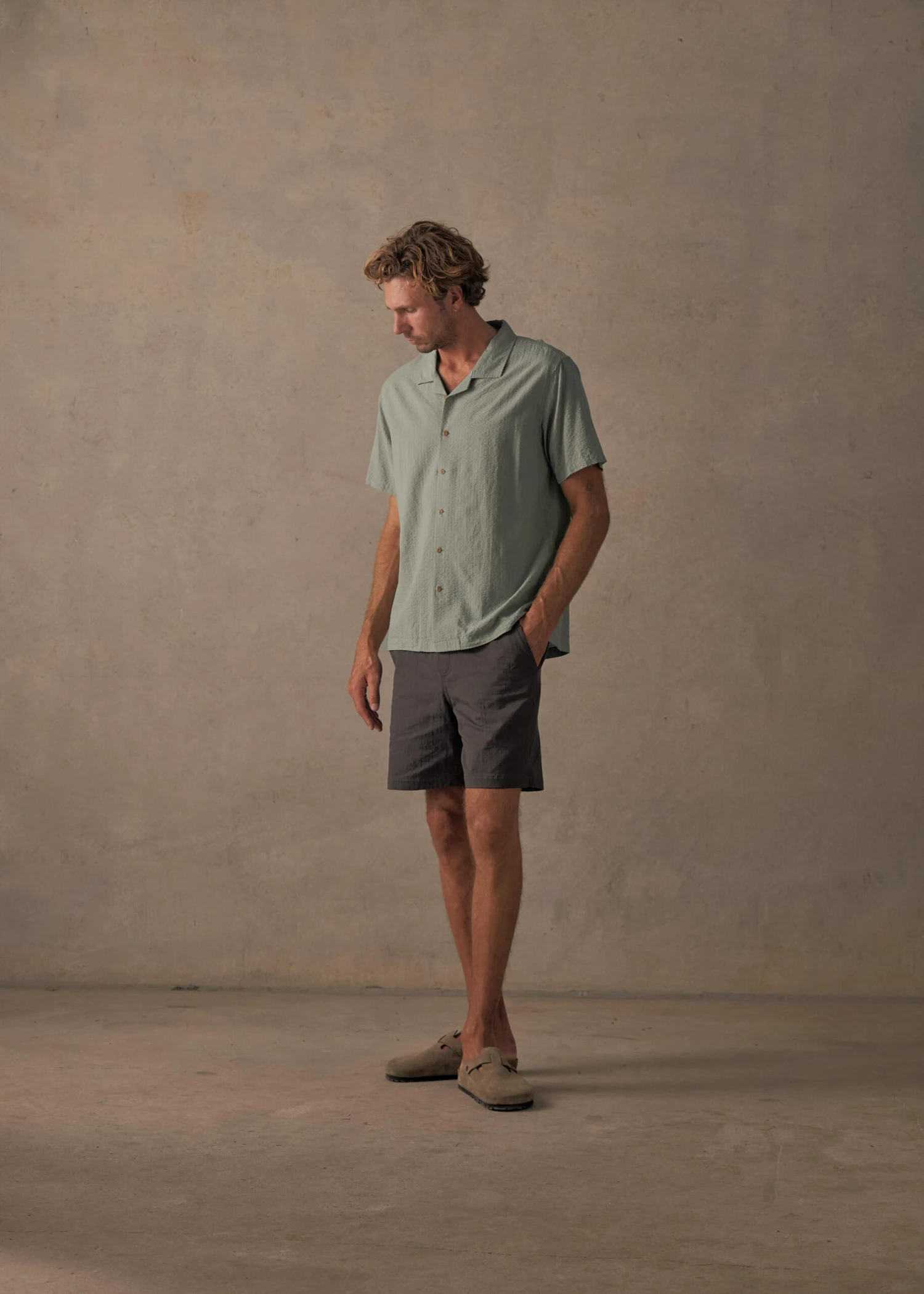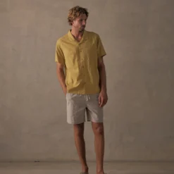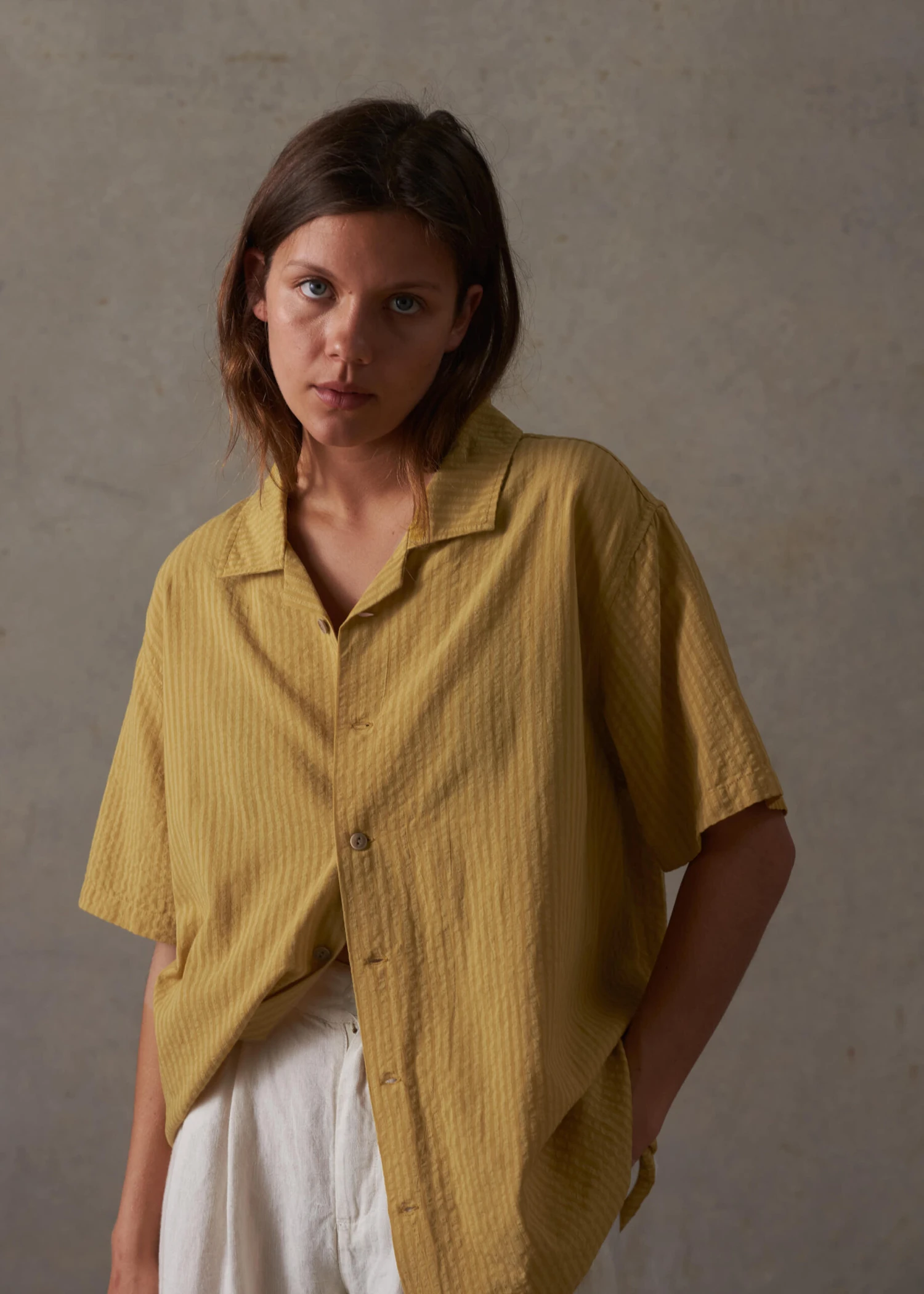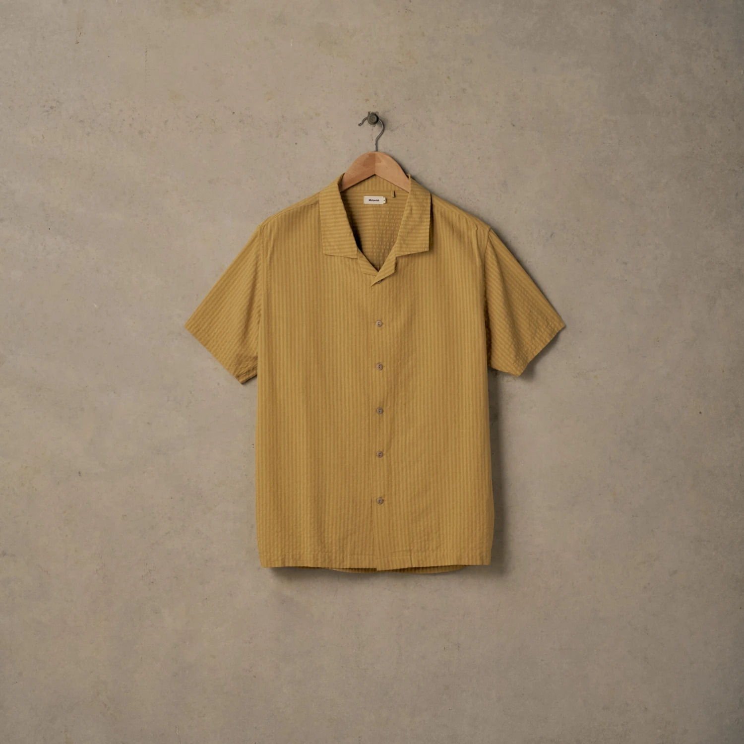 Equal parts nostalgia and elevated relaxation, this softly seersucker-esque textured shirt is silky smooth against your skin – but won’t have you sweating up underneath. It features corozo summarys, relaxed camp collar styling and it’s available in three unique colours; sage, saffron, and north sea.