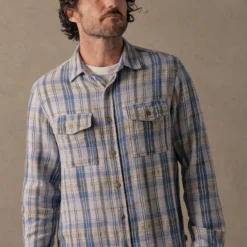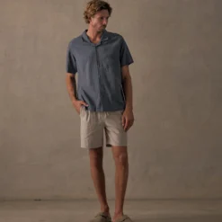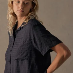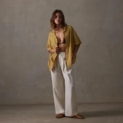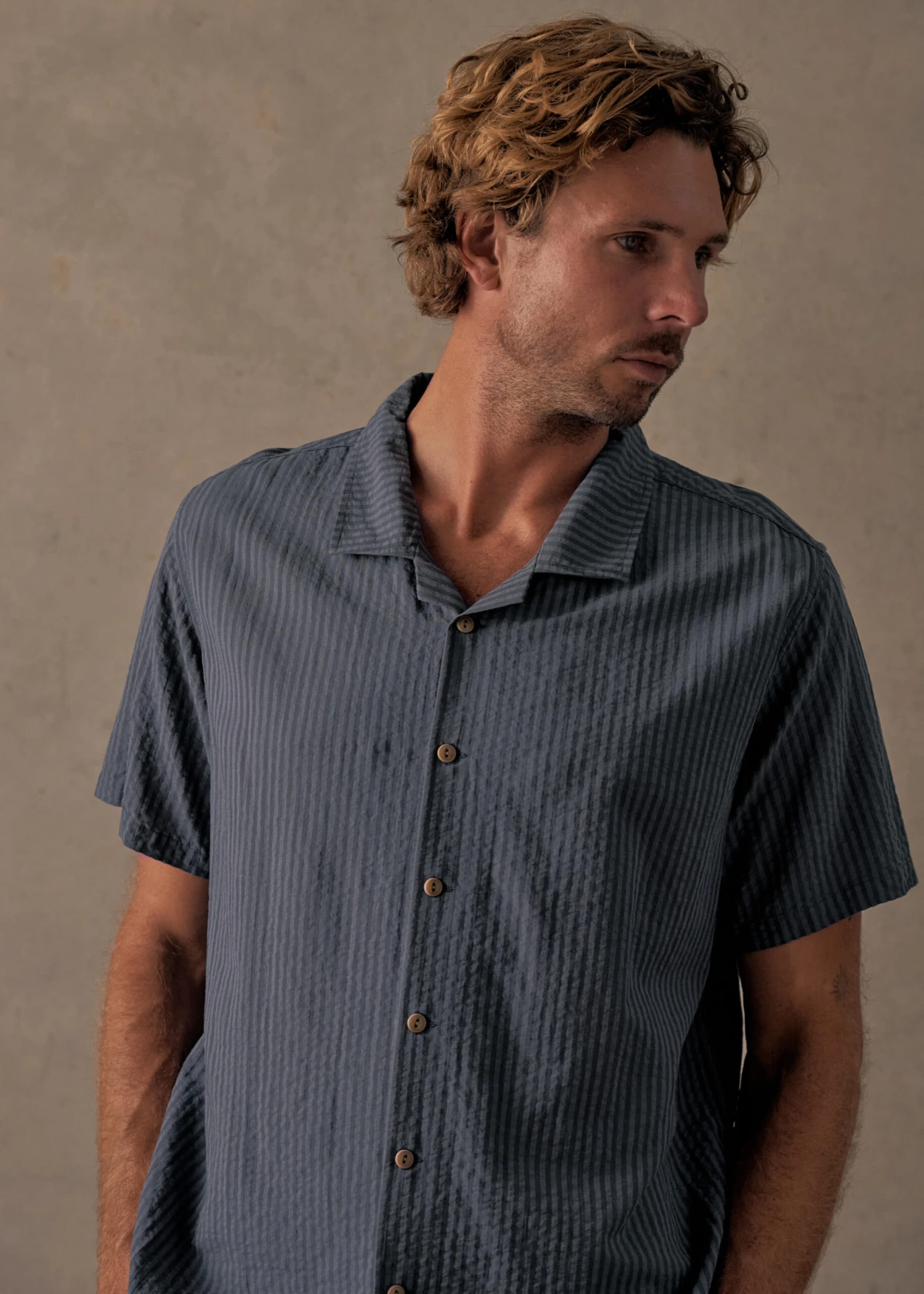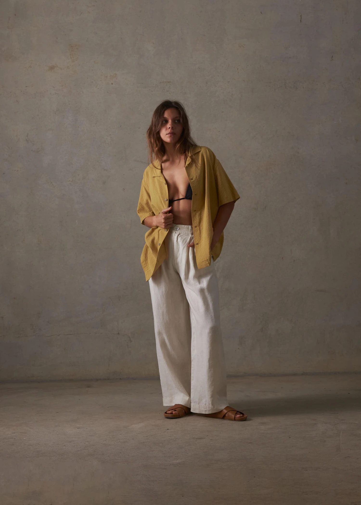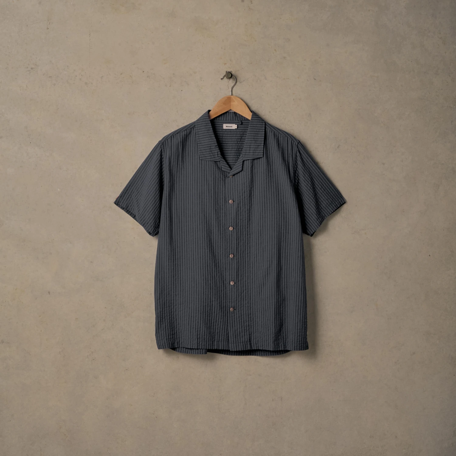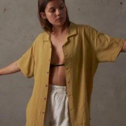 Equal parts nostalgia and elevated relaxation, this softly seersucker-esque textured shirt is silky smooth against your skin – but won’t have you sweating up underneath. It features corozo summarys, relaxed camp collar styling and it’s available in three unique colours; sage, saffron, and north sea.