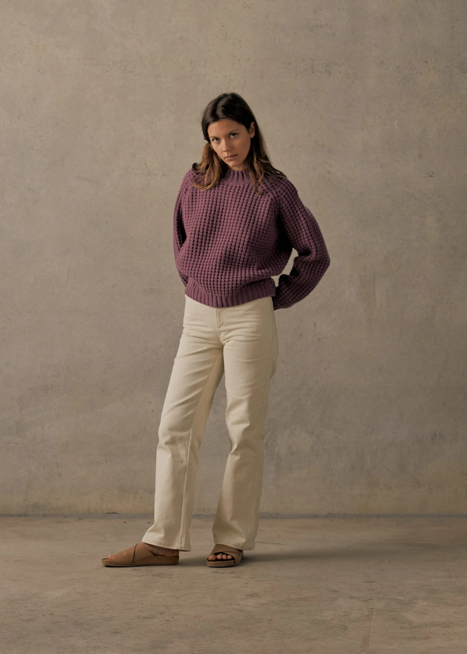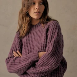 Knitted from the Queen of Wool, pure Merino, in giant waffle stitches and a chunky ribbed trim to keep chilly temperatures at bay. The Stitched Merino Crew comes in a relaxed, slightly boxy fit and is available in Mulberry purple.